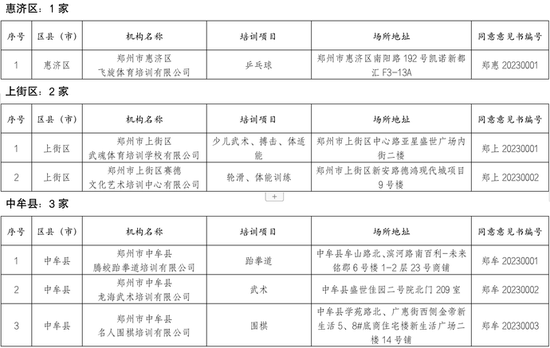 7月5日,记者从郑州市体育局获悉,为严格落实国家“双减”政策,根据《河南省体育类校外培训机构设置标准和管理指南(试行)》和《郑州市体育类校外培训机构设置标准和管理指南(试行)》通知要求,经各开发区和区县(市)体育主管部门审核同意,截至6月30日,共有39家体育类校外培训机构取得线下培训资质,现正式面向社会发布(详见附表)。