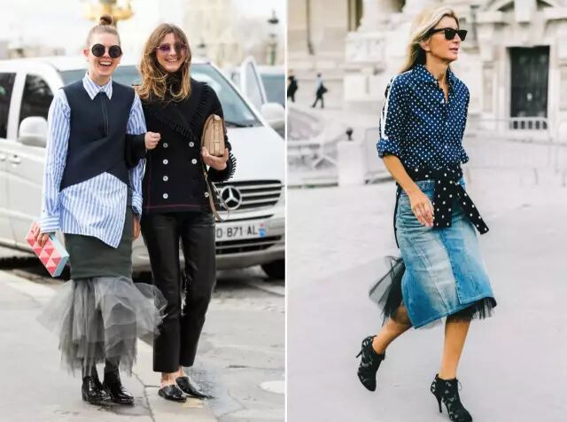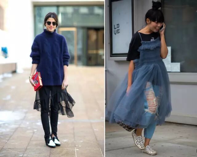 ▼这也是老生常谈的穿法咯~柔美的纱裙搭配衬衫或T恤又不失干净利落之感。